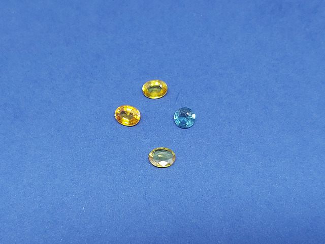 Córindon (var. Safira). Set com 4 gemas, sendo três amarelas e uma azul