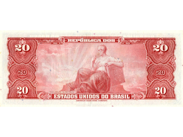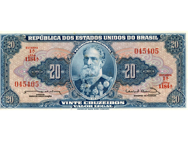 Cédula de 20 cruzeiros, azul, estampada com Deodoro da Fonseca (Estampa 1, série 1184, serial 45405). Chancelas (Diretor da Caixa de Amortização e Ministro da Fazenda): Reginaldo Fernandes Nunes e Miguel Calmon.