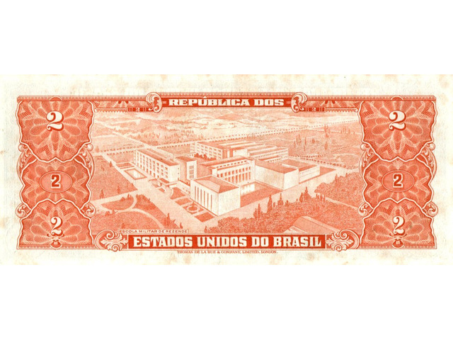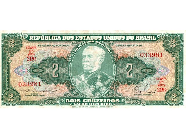 Cédula de 2 cruzeiros, verde, estampada com Duque de Caxias e fundo amarelo-ocre (Estampa 2, série 219, serial 33981). Chancelas (Diretor da Caixa de Amortização e Ministro da Fazenda): Claudionor de Souza Lemos e Eugênio Gudin.