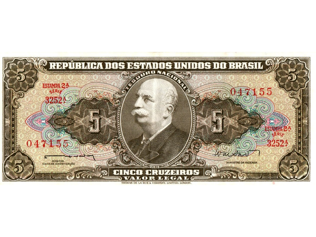 Cédula de 5 cruzeiros, marrom, estampada com o Barão de Rio Branco (Estampa 2, série 3252, serial 47155). Chancelas (Diretor da Caixa de Amortização e Ministro da Fazenda): Reginaldo Fernandes Nunes e Walter Moreira Salles.