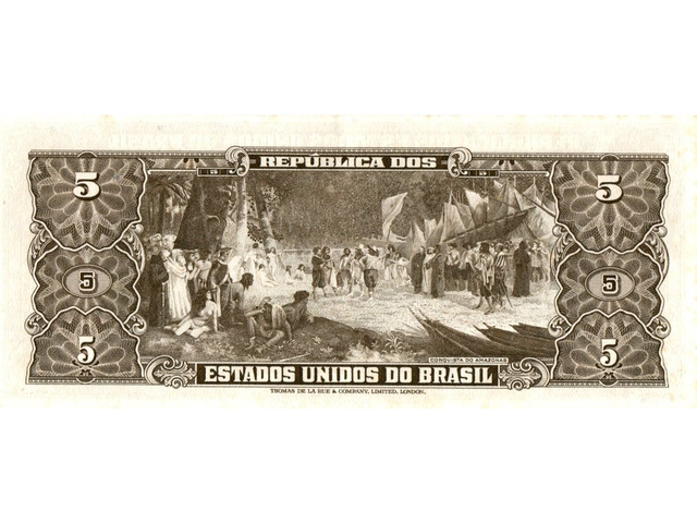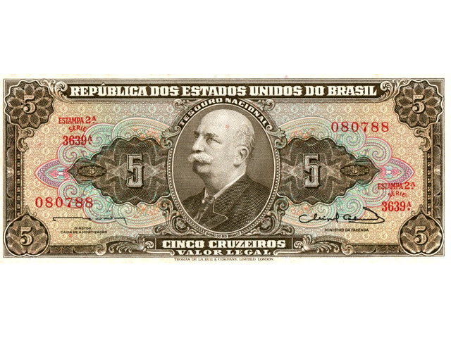 Cédula de 5 cruzeiros, marrom, estampada com o Barão de Rio Branco (Estampa 2, série 3639, serial 80788). Chancelas (Diretor da Caixa de Amortização e Ministro da Fazenda): Reginaldo Fernandes Nunes e Miguel Calmon.