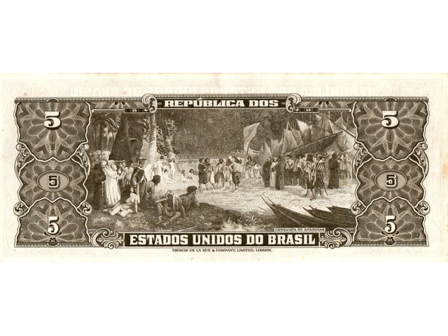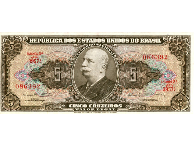 Cédula de 5 cruzeiros, marrom, estampada com o Barão de Rio Branco (Estampa 2, série 3957, serial 86392). Chancelas (Diretor da Caixa de Amortização e Ministro da Fazenda): Sérgio Augusto Ribeiro e Octávio Gouvêa Bulhões.