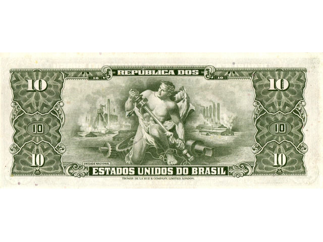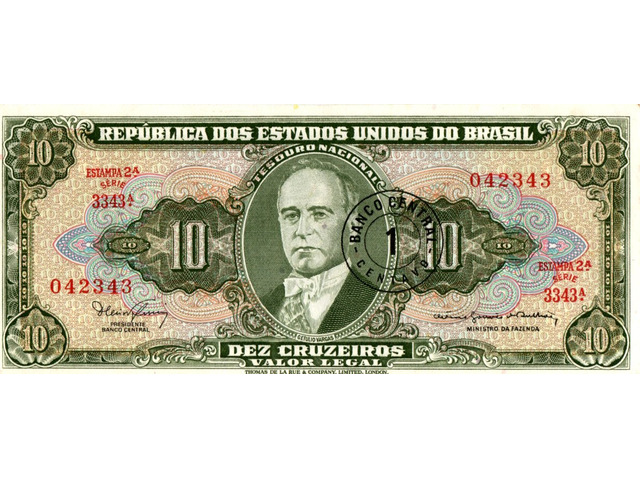 Cédula de 10 cruzeiros com carimbo de 1 centavo, estampada com Getúlio Vargas - Chancela: Ministro (Estampa 2, série 3343, serial 42343). Chancelas (Diretor da Caixa de Amortização e Ministro da Fazenda): Dênio Nogueira e Octávio Gouvêa Bulhões.