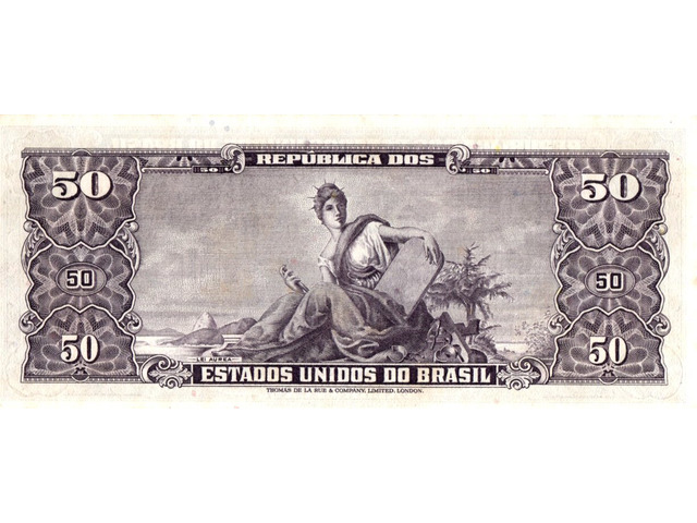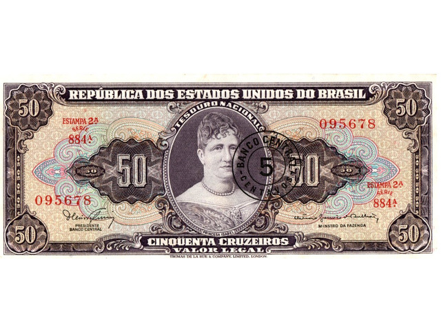 Cédula de 50 cruzeiros com carimbo de 5 centavos, estampada com a Princesa Isabel - Chancela: Minstro (Estampa 2, série 884, serial 95678). Chancelas (Diretor da Caixa de Amortização e Ministro da Fazenda): Dênio Nogueira e Octávio Gouvêa Bulhões.