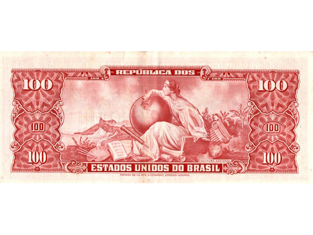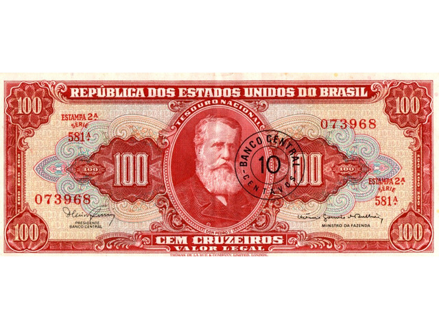 Cédula de 100 cruzeiros com carimbo de 10 centavos, estampada com D. Pedro II - Chancela: Minstro (Estampa 2, série 581, serial 73968). Chancelas (Diretor da Caixa de Amortização e Ministro da Fazenda): Dênio Nogueira e Octávio Gouvêa Bulhões.