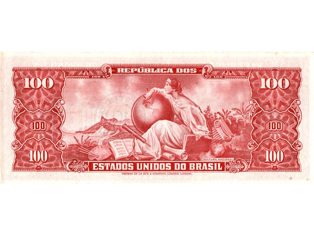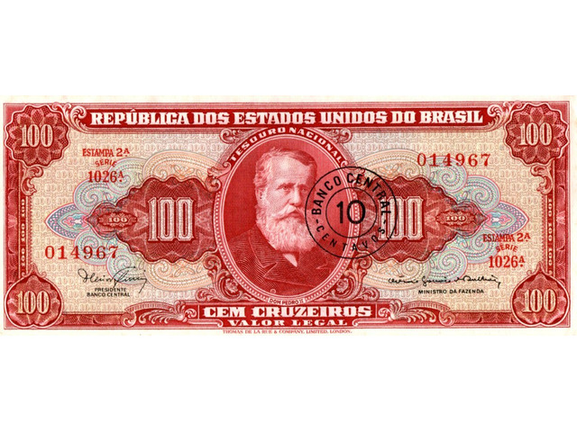 Cédula de 100 cruzeiros com carimbo de 10 centavos, estampada com D. Pedro II - Chancela: Ministro (Estampa 2, série 1026, serial 14967). Chancelas (Diretor da Caixa de Amortização e Ministro da Fazenda): Dênio Nogueira e Octávio Gouvêa Bulhões.