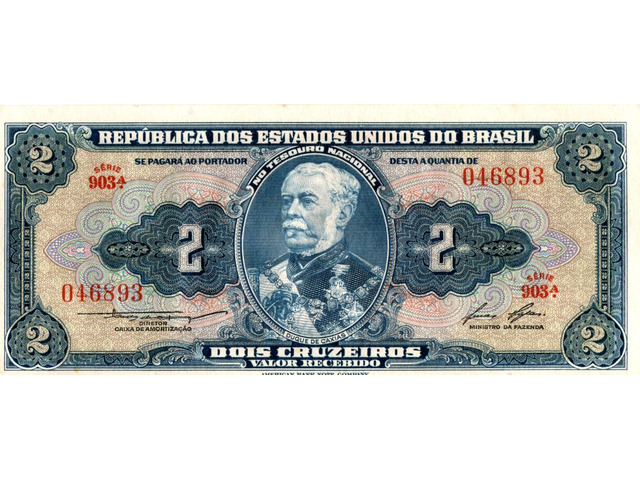 Cédula de 2 cruzeiros, azul, estampada com Duque de Caxias (Estampa 1, série 903, serial 46893). Chancelas (Diretor da Caixa de Amortização e Ministro da Fazenda): Claudionor de Souza Lemos e Lucas Lopes.