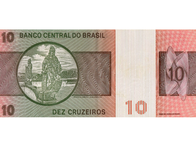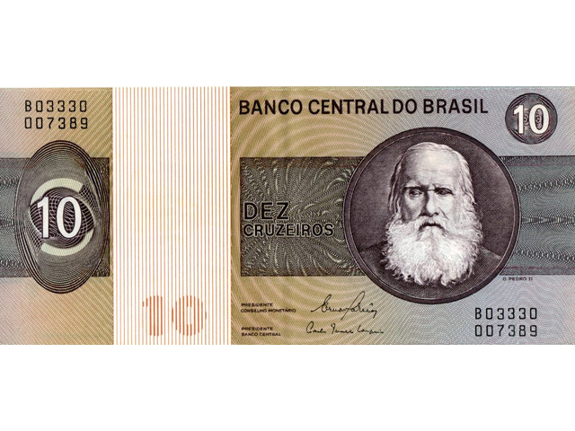 Cédula de 10 cruzeiros, estampada com D. Pedro II (Estampa B, série 3330, serial 7389). Chancelas (Conselho Monetário e Presidente do Banco Central): Ernane Galveas e Carlos Geraldo Langoni.