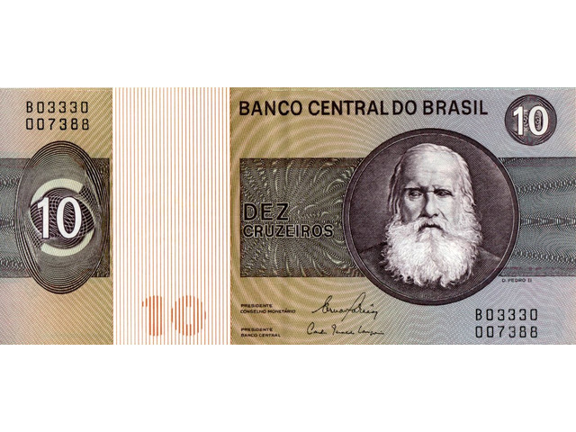 Cédula de 10 cruzeiros, estampada com D. Pedro II (Estampa B, série 3330, serial 7388). Chancelas (Conselho Monetário e Presidente do Banco Central): Ernane Galveas e Carlos Geraldo Langoni.