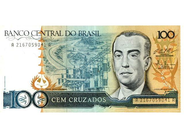 Cédula de 100 cruzados, estampada com Juscelino Kubitschek (Estampa AA, série 2167, serial 59041). Chancelas (Conselho Monetário e Presidente do Banco Central): Luiz Carlos Bresser Pereira e Fernando Milliet de Oliveira.